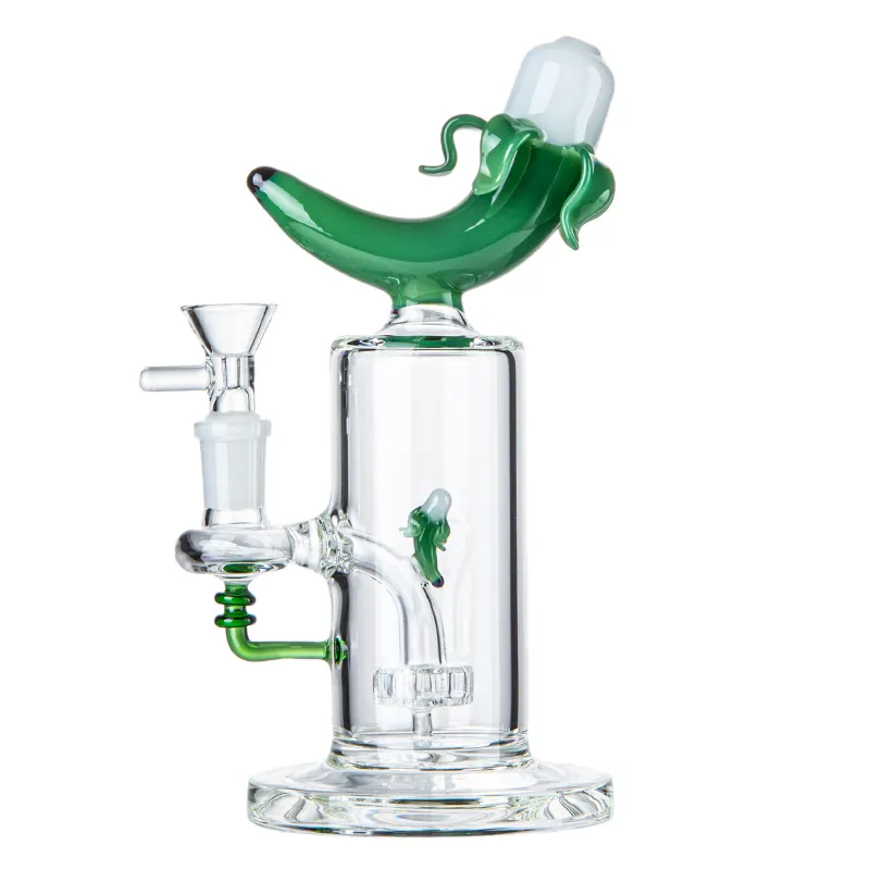The colorful banana mouthpiece on the glass bongs give you a refreshed impression.